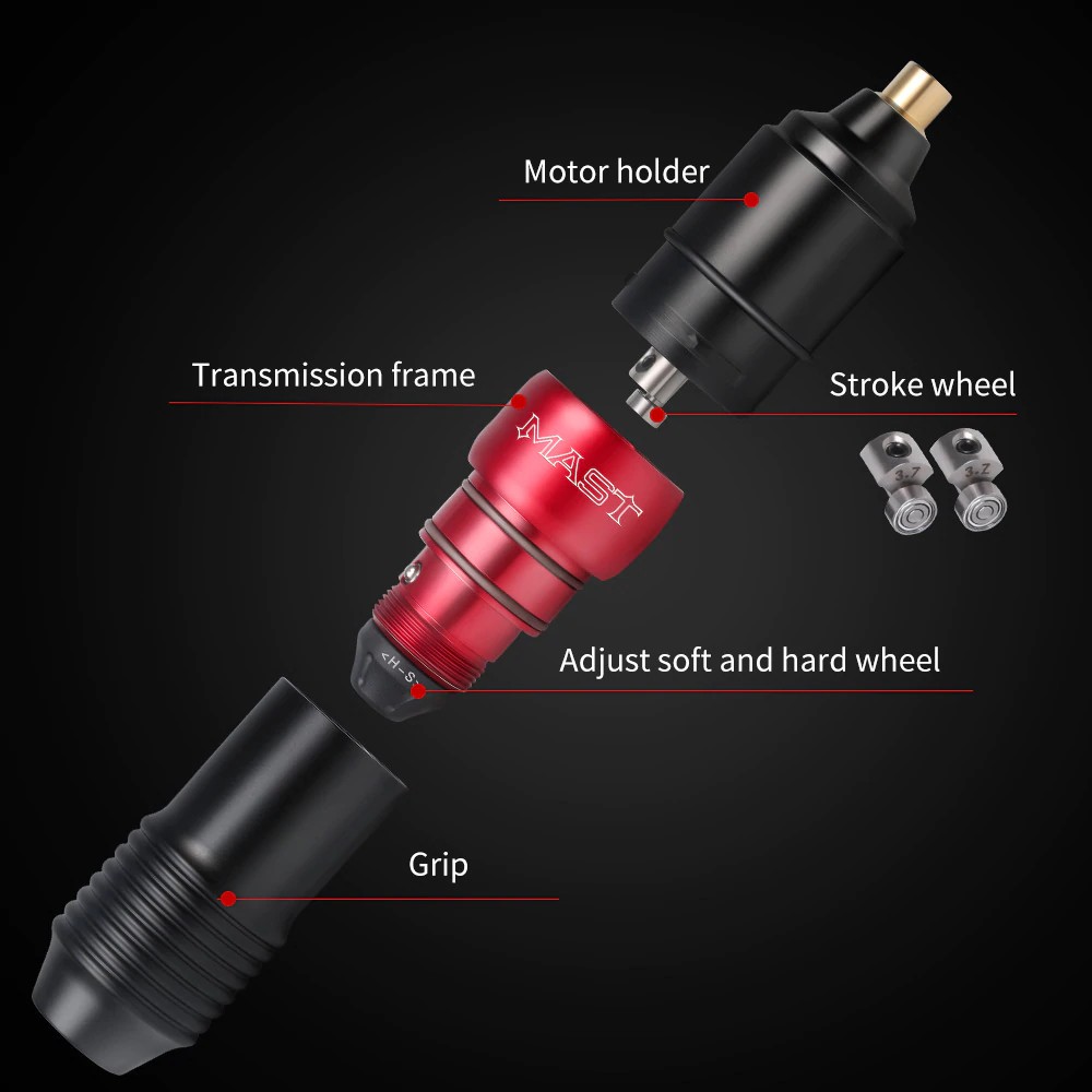 Mast tour pro tattoo rotary pen machine stroke length 3.6 mm. This tattoo machine rotary compatible with all standard power supplies and wireless power battery.